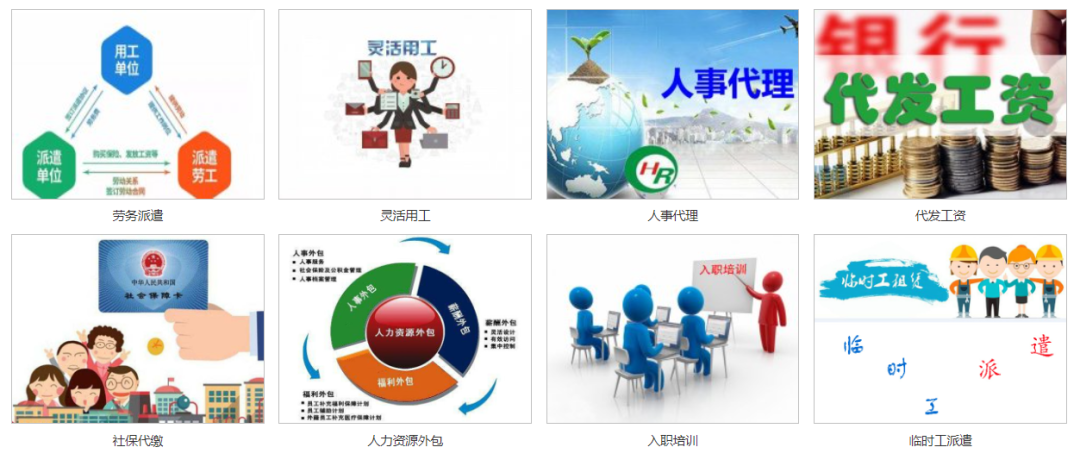 公司从事劳务派遣、人才租赁、跨境电商、工程检测、劳务外包、人事外包、薪酬外包、企业管理服务的企业公司在人员招聘、用工管理、宿舍服务、人员撤离、风险管理等方面累积了丰富的经验,形成以人力资源RPO服务、委托招聘、劳务外包、劳务派遣、劳务专送、企业政策咨询、企业培训及会务策划、人事代理等为主的服务板块。