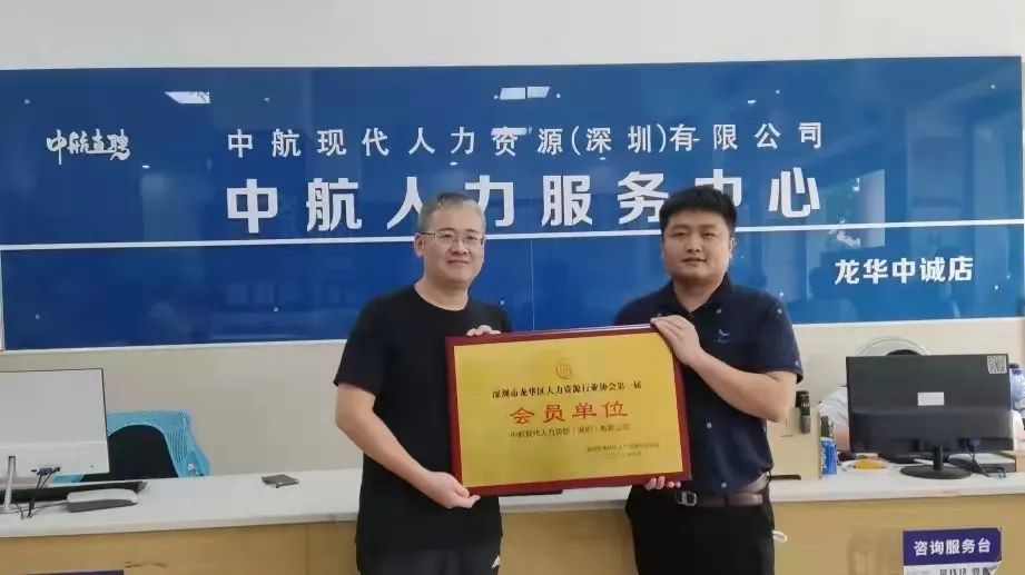 7月11日,龙华区人力资源行业协会秘书长欧江前往柏龙大厦,为会员单位中航现代人力资源(深圳)有限公司授予协会会员单位牌匾,中航人力总经理余镇涛参加了授牌仪式。