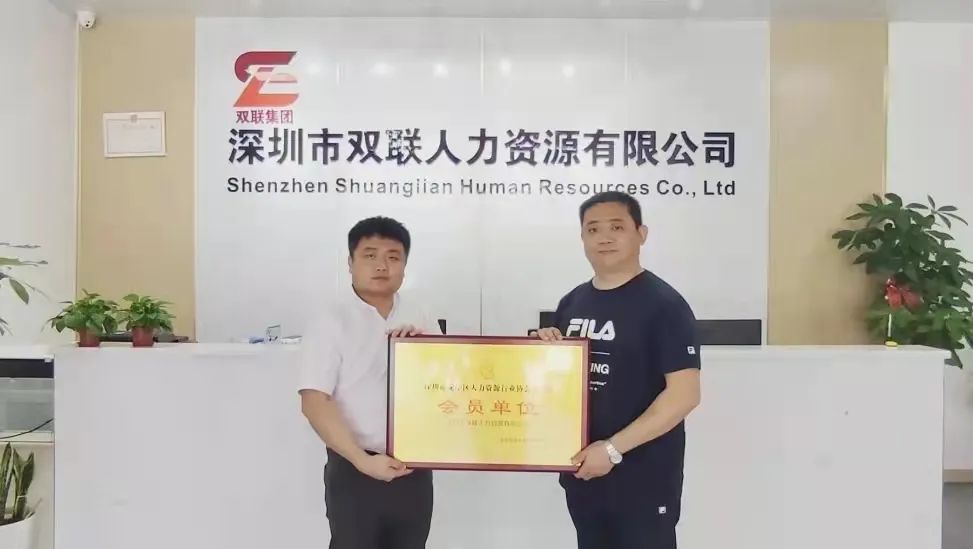 7月13日,龙华区人力资源行业协会为深圳市双联人力资源有限公司举行授牌仪式,人力资源行业党总支委员、行业协会秘书长欧江向双联人力董事长李义忠授予了协会会员单位牌匾。