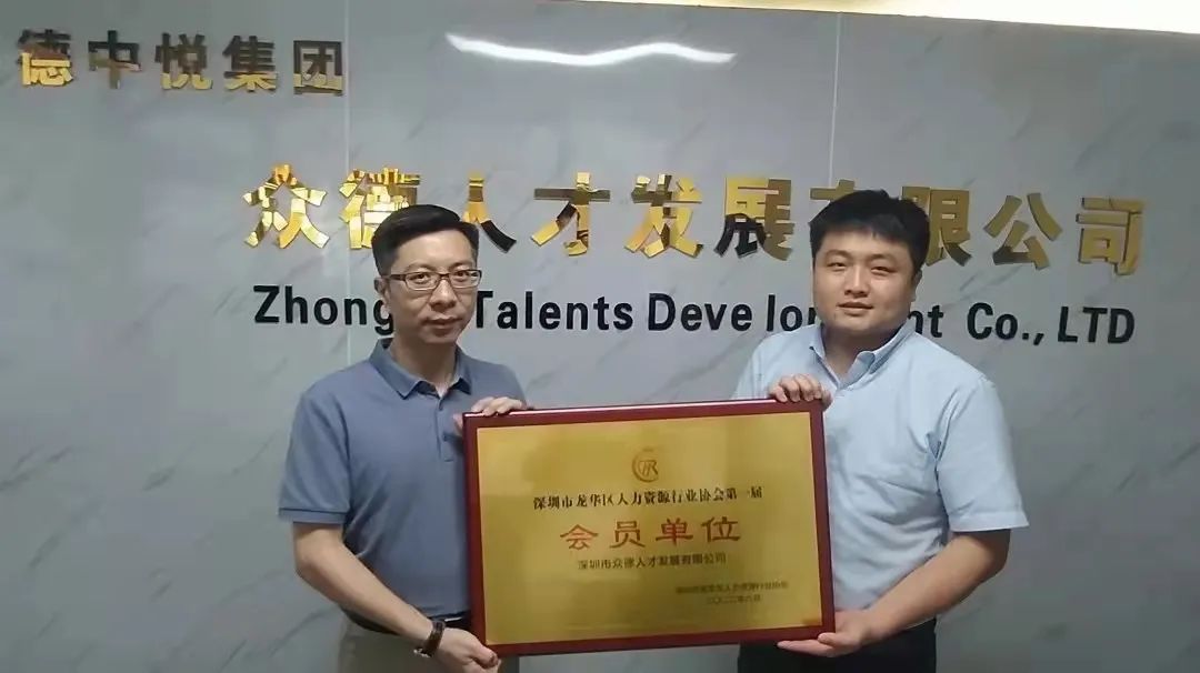 7月14日,龙华区人力资源行业协会为深圳市众德人才发展有限公司举行授牌仪式,龙华区人力资源行业协会秘书长欧江向众德人力董事长朱志强授予了协会会员单位牌匾。