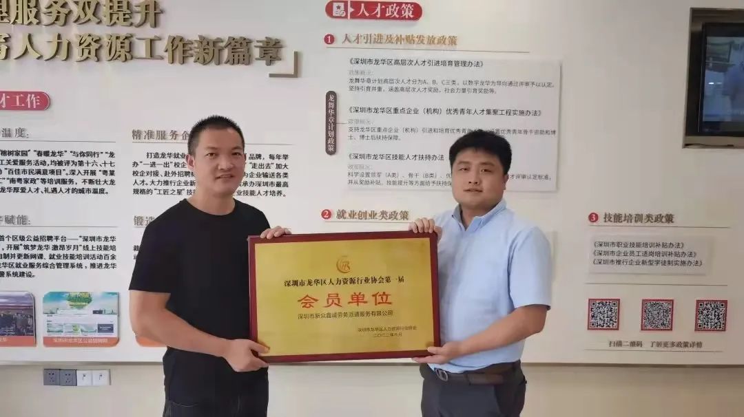 7月15日,龙华区人力资源行业协会在龙华人才园为深圳市新众鑫诚劳务派遣服务有限公司举行了授牌仪式,龙华区人力资源行业协会秘书长欧江向众鑫诚董事长王磊授予了协会会员单位牌匾