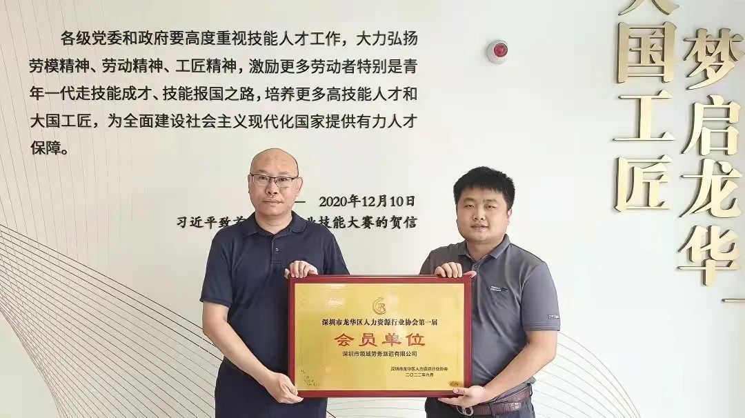 7月19日,龙华区人力资源行业协会在龙华人才园为深圳市领域劳务派遣服务有限公司举行了授牌仪式,龙华区人力资源行业协会秘书长欧江向领域劳务董事长梁波授予了协会会员单位牌匾。