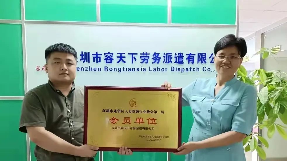 7月20日,龙华区人力资源行业协会秘书长欧江前往荣群大厦,为会员单位深圳市容天下劳务派遣有限公司授予协会会员单位牌匾,容天下劳务总经理周容参加了授牌仪式。