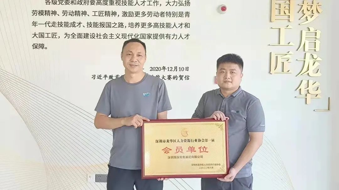 7月22日,深圳市龙华区人力资源行业协会在龙华人才园为深圳豫深劳务派遣有限公司举行了授牌仪式,龙华区人力资源行业协会秘书长欧江向豫深劳务董事长石乃友授予了协会会员单位牌匾。