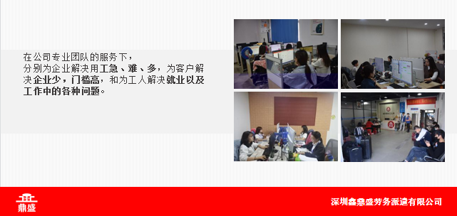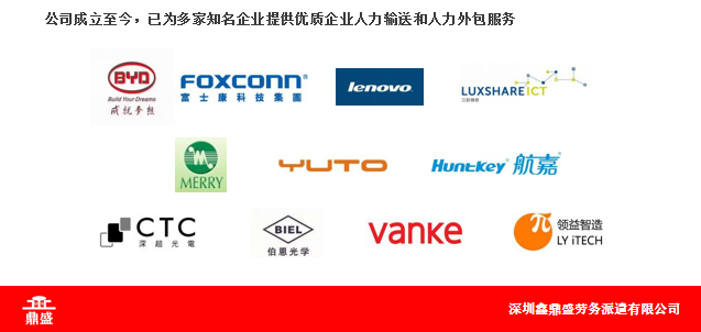 深圳鑫鼎盛劳务派遣有限公司成立于2020年8月7号,注册地位于龙华区龙华街道富康社区东环二路8号中执时代广场。是专业从事立讯,比亚迪,富士康等集团优质企业人力输送和人力外包服务的企业。成立至今,已有一支160余人的专业化高素质团队,全部具备中专,大专以上的学历。并且拥有多年从事人力资源,工作介绍的丰富经验。