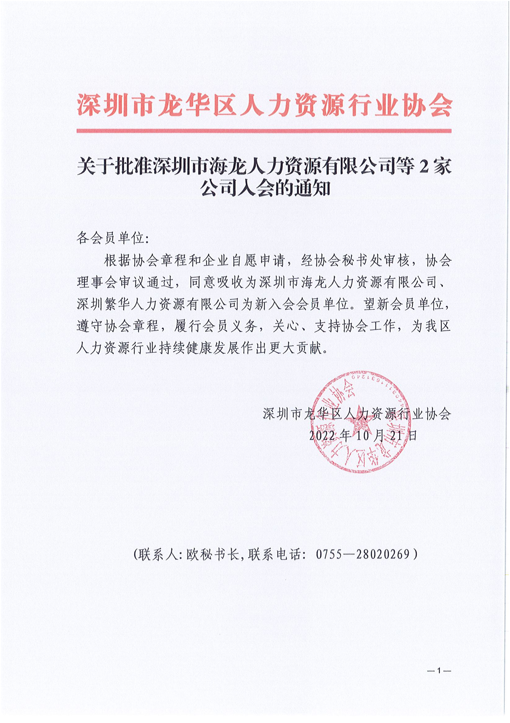 关于批准深圳市海龙人力资源有限公司等2家公司入会的通知