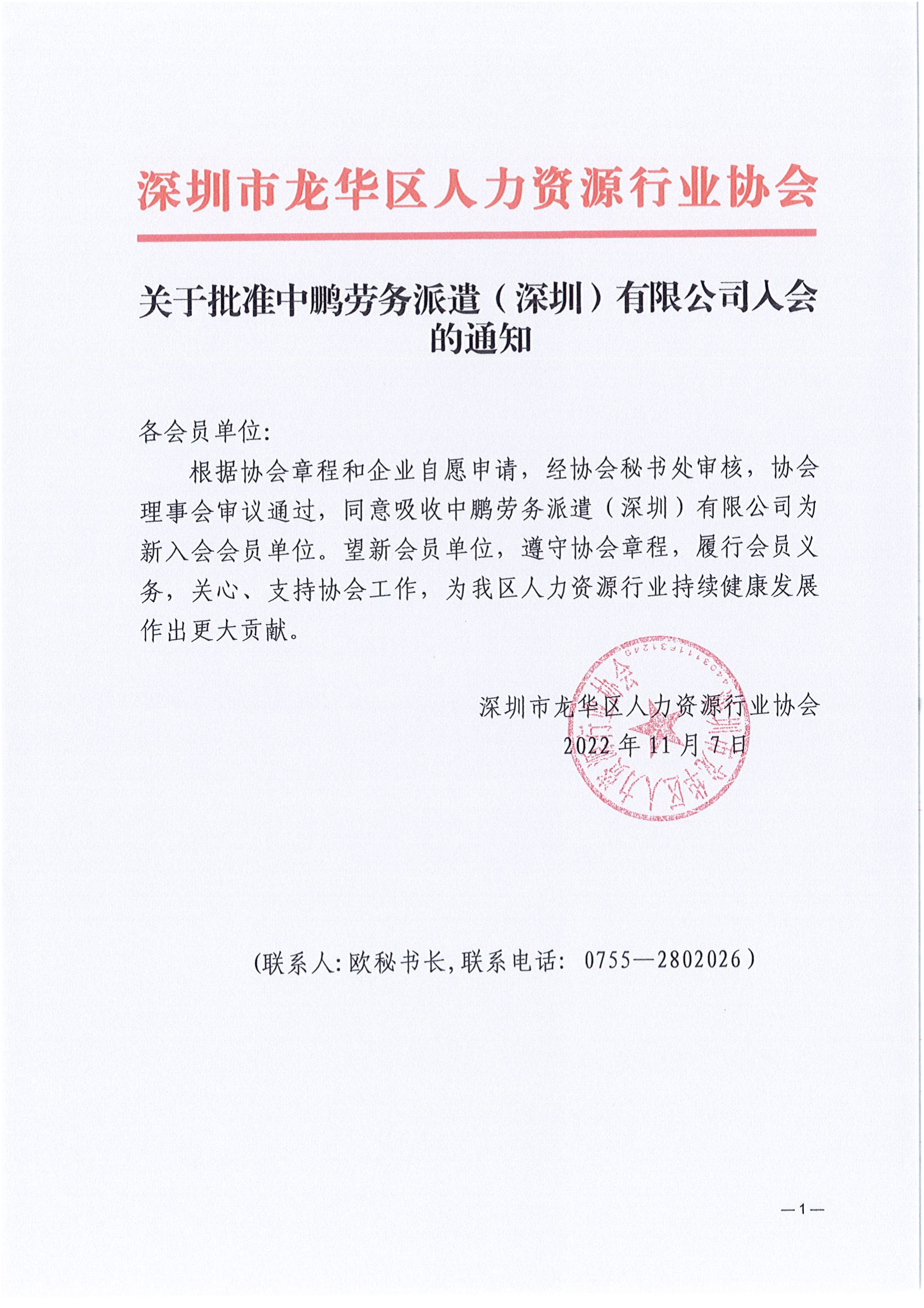 关于批准中鹏劳务派遣(深圳)有限公司入会的通知