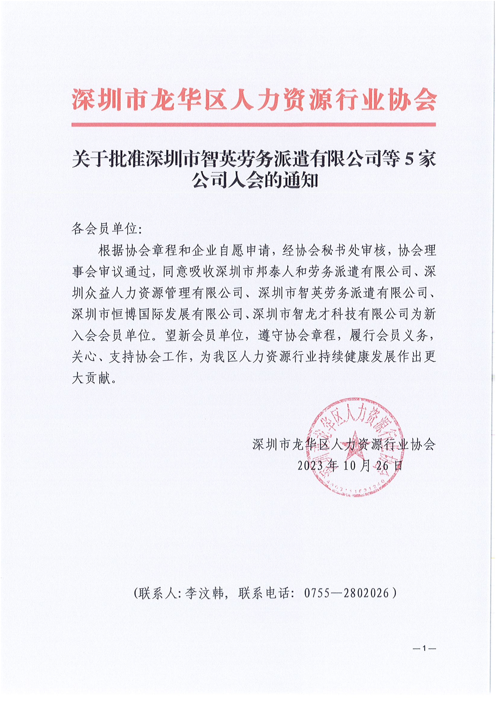 关于批准深圳市智英劳务派遣有限公司等5家公司入会的通知
