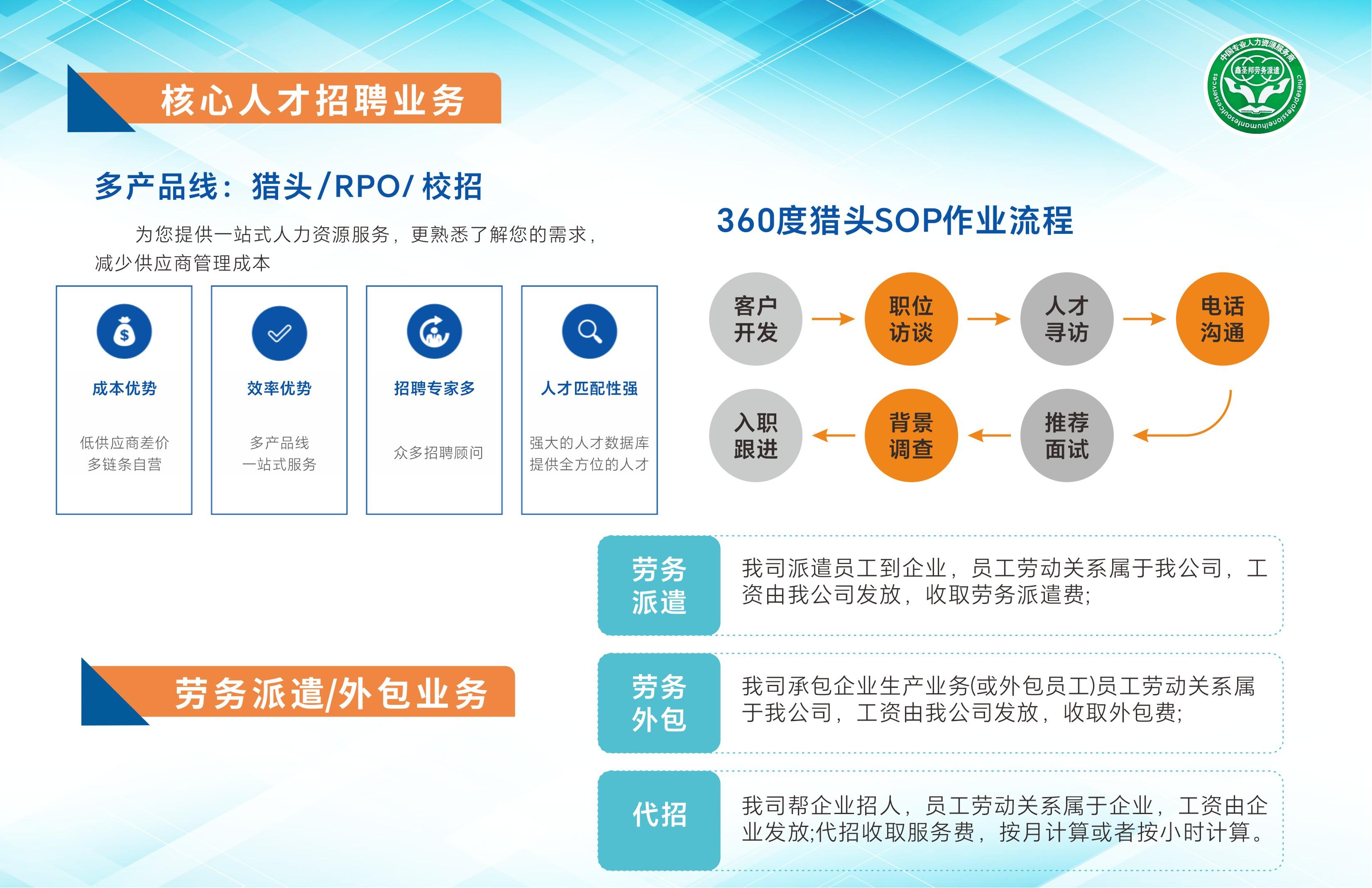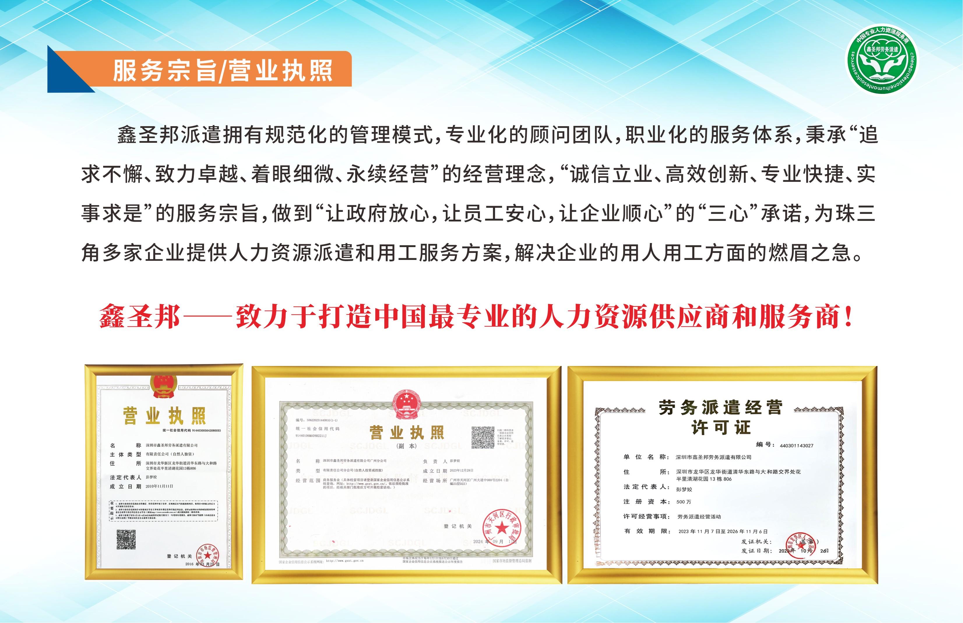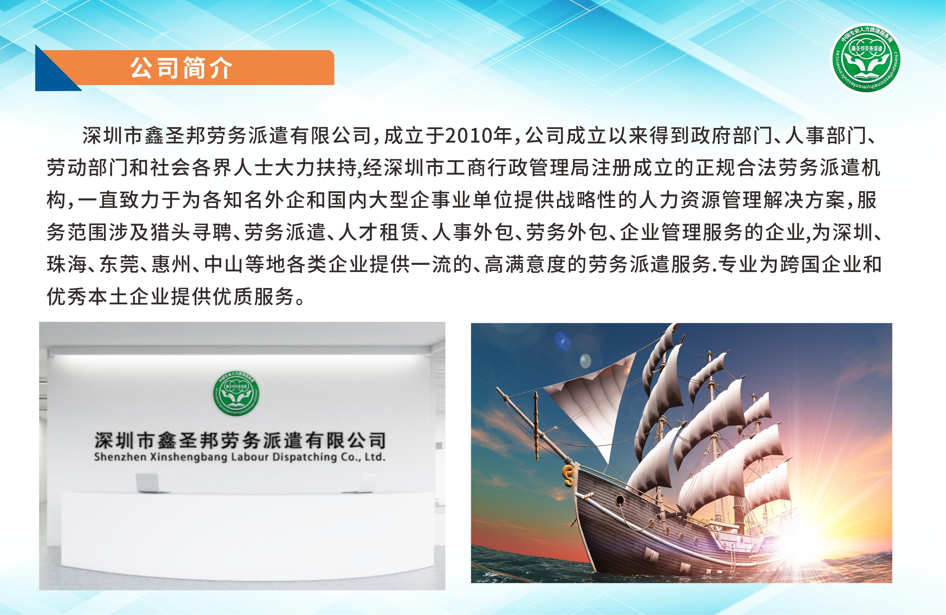 深圳市鑫圣邦劳务派遣有限公司,成立于2010年,是深圳市龙华区人力资源行业协会优秀会员单位,公司成立以来得到政府部门、人事部门劳动部门和社会各界人士大力扶持,经深圳市工商行政管理局注册成立的正规合法劳务派遣机构,一直致力于为各知名外企和国内大型企事业单位提供战略性的人力资源管理解决方案,服务范围涉及猎头寻聘、劳务派遣、人才租赁、人事外包、劳务外包、企业管理服务的企业,为深圳珠海、东莞、惠州、中山等地各类企业提供一流的、高满意度的劳务派遣服务.专业为跨国企业和优秀本土企业提供优质服务。